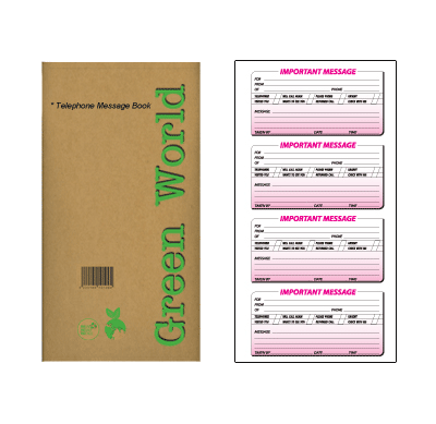 Printed out of NCR 2 ply paper White and Yellow (any other colour possible). Printed in two colours, perforations on the first copy. One white board with a perforation to remove from the book and keep under each set to prevent the image passing to the other copies. |